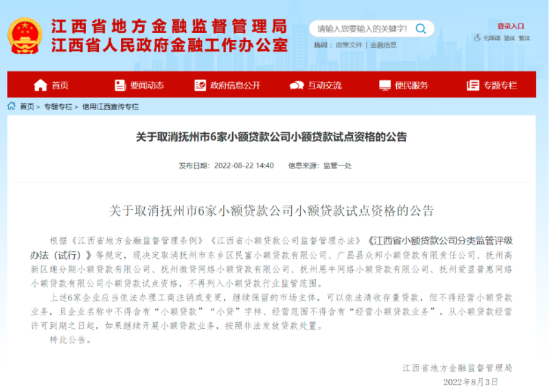 减药:管控再审“全方位喊停新开设互联网小贷从事组织”江西金融监管局的这篇公告称:依据《江西省地方金融监督管理条例》《江西小额贷款企业监督管理办法》《江西小额贷款公司分类监管评级方法(实施)》等相关规定,现确定撤销抚州市东乡区民富小额贷款有限责任公司、广昌县众邦小额贷款责任有限公司、抚州高新区趣分期小额贷款有限责任公司、抚州微贷互联网小额贷款有限责任公司、抚州市恩牛互联网小额贷款有限责任公司、抚州爱盈普惠互联网小额贷款有限责任公司6家小额贷款示范点资质,不会再纳入小额贷款行业管理范畴。