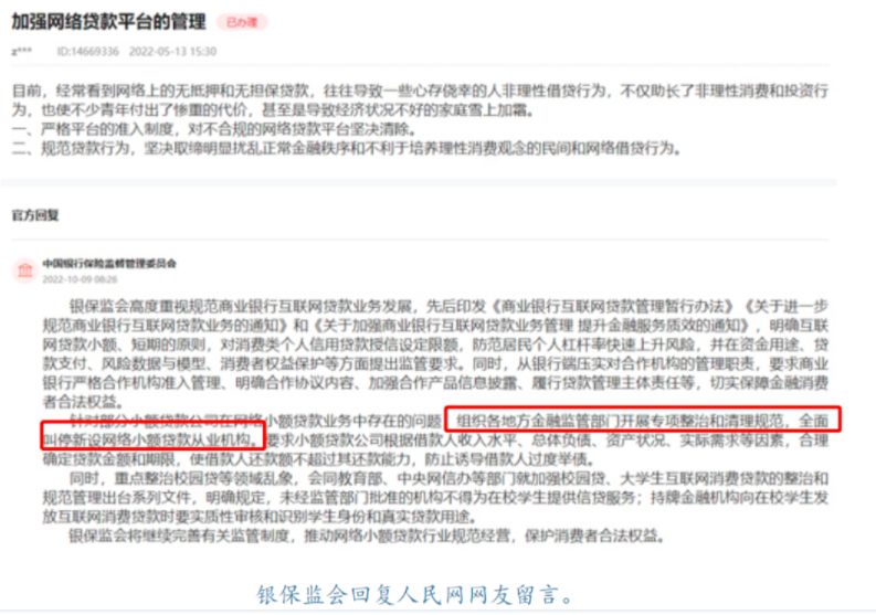 10月9日,银监会对其人民日报网网民有关“提升网络借贷平台的监管”的回应中表态发言“全方位喊停新开设互联网小贷从事组织”。